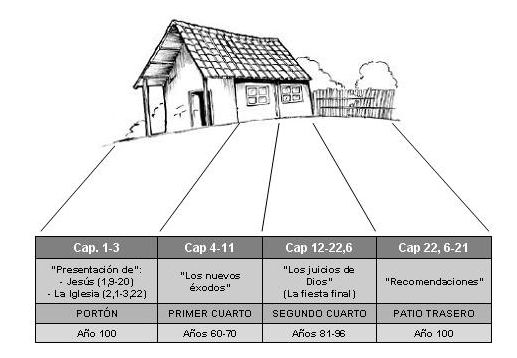 El Apocalipsis se parece a una casa museo, llena de cuadros, que comienza con un portón grande (cap 1-3), luego se avanza y tenemos el primer cuarto, que está copado de cuadros que nos recuerdan al Éxodo antiguo y nuevo (cap 4-11); el segundo cuarto igualmente está lleno de cuadros sobre los juicios de Dios al Imperio (12-22) y termina con un patio trasero de recomendaciones.